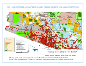 Under international law conventions, all migrants are entitled to basic fundamental rights protecting their livelihood and dignity, and many argue that U.S. immigration policy has the distinct, though perhaps unintended, effect of violating certain tenets of these treatises. The “Border Patrol Strategic Plan for 1994 and Beyond” laid the groundwork for the implementation of several landmark border reforms including: Operation Gatekeeper, Operation Hold the Line, and Operation Safeguard. These plans were geared to amplify border control at key urban centers and idealistically create a natural deterrent, by redirecting illegal traffic through the harsh and inhospitable desert and mountain regions, like those of southern Arizona. According to Amnesty International, this strategy of “prevention through deterrence” had marginal effects on the numbers of illegal crossings, but has rather shifted migrant traffic through “more hostile terrain that placed them in mortal danger.” [1] Between 1998 and 2008, estimates of more than 5,000 deaths have been compiled and a report by the Government Accountability Office (GAO) found that inconsistent data collection and coordination between agencies might mean even these high figures are severely underestimated.[2]