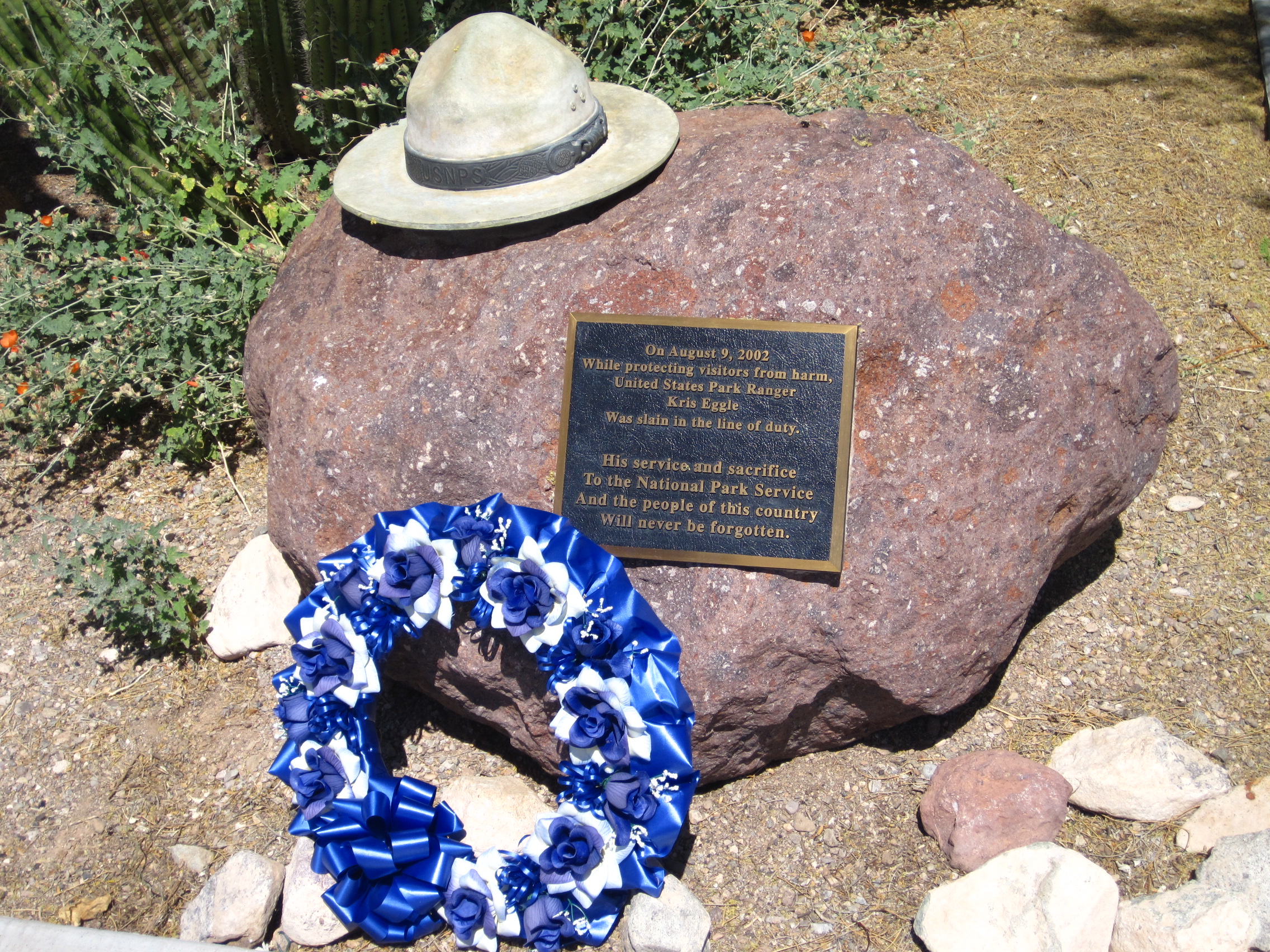 While patrolling on August 9, 2002, Eggle heard a radio report that the Mexican police were chasing a stolen SUV that had just crossed through a hole in the international fence into Organ Pipe.[3] Eggle and border patrol agent Isaac Cohen immediately responded to the radio report and began their pursuit of the fugitives. When Eggle and Cohen caught up to the men one of them had surrendered, and the other took off across the desert on foot. Eggle began to sprint after the second fugitive. As he caught up with the cartel, member Eggle was shot three times. He died soon after. A friend and fellow Organ Pipe ranger commented, “Kris died serving his country and his death has great value and meaning. But the life of Kris Eggle, even more